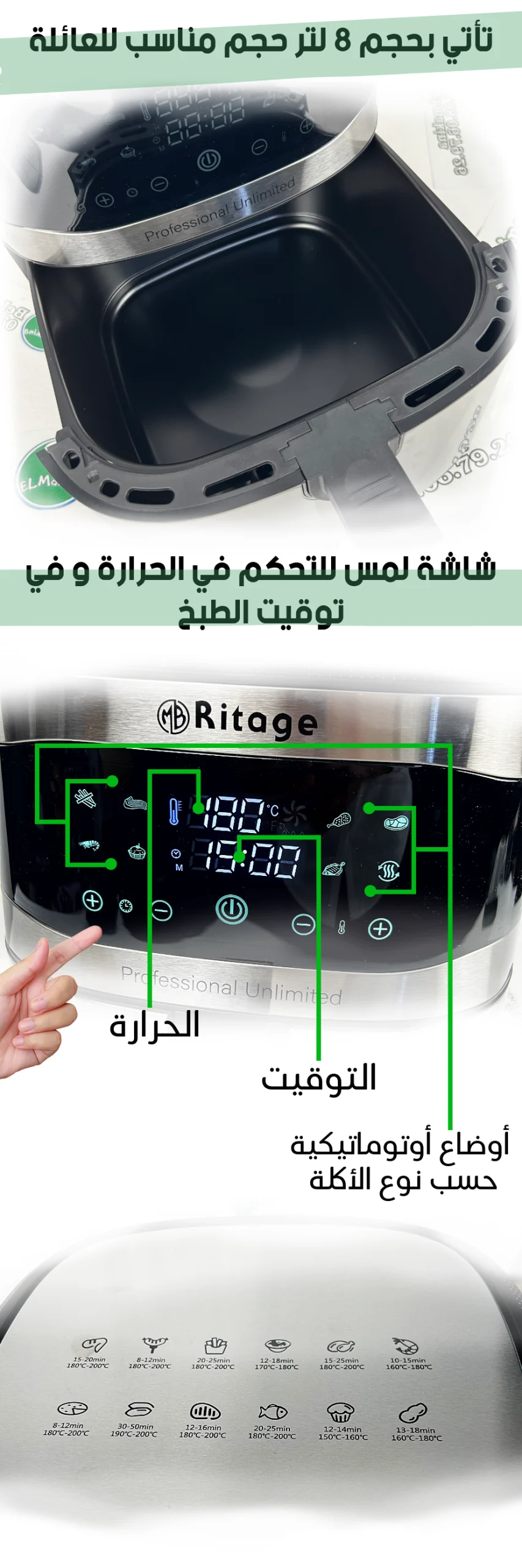 قلاية عائلية كبيرة تمنحك طهيًا سريعًا ومقرمشًا بفضل دوران الهواء الساخن، مع زيت أقل بكثير مقارنةً بالقلي التقليدي، ما يجعلها خيارًا أخف من ناحية الدهون والسعرات مع الحفاظ على القوام اللذيذ. واجهة لمس واضحة مع برامج جاهزة للتحكّم الدقيق، وهيكل ستانلس أنيق وسهل التنظيف ليليق بمطبخك العصري.